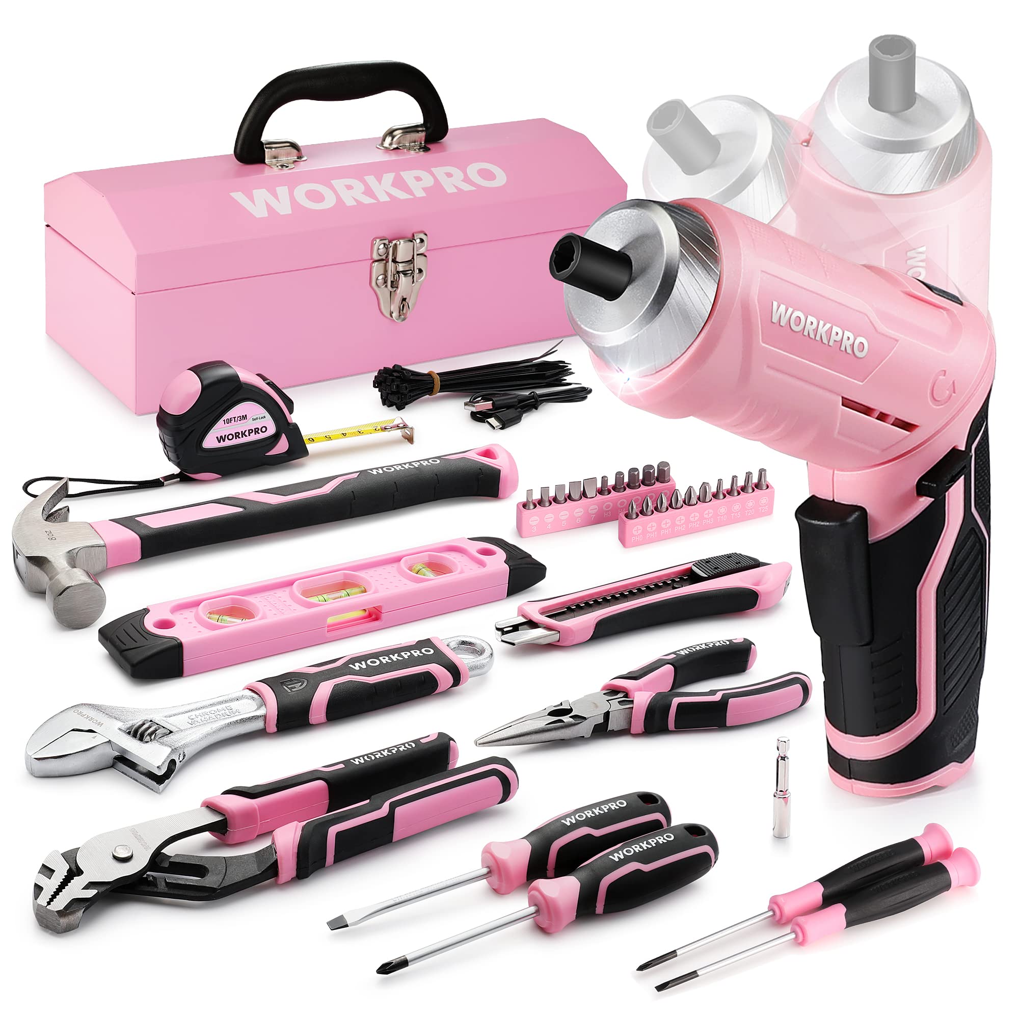 Boite a Outils Pink Rose 53 Pieces WORKPRO avec Tournevis sans Fil 3,7 V, Caisse a Outils Complete avec Sac Durable, Trousse a Outils Rose Parfait pour Bricolage, Entretien Domestique