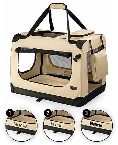 lionto Caisse de Transport Pliable pour Chien & Chat, 70x52x50 cm, Tissu Oxford Robuste + poignées & Couverture, pour Animaux Jusqu’à 15 kg, Caisse pour Petits & Grands, Beige (avec nom imprimé)
