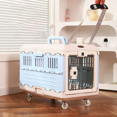 Transport Chien Boîte De Transport Pliable Matériau PP Comprend des Bretelles, des roulettes Et Une Poignée Voyages Animaux Voiture Avion Train Deux Tailles Caisse Chien(Blue,40.3 * 68.6 * 47.8cm)