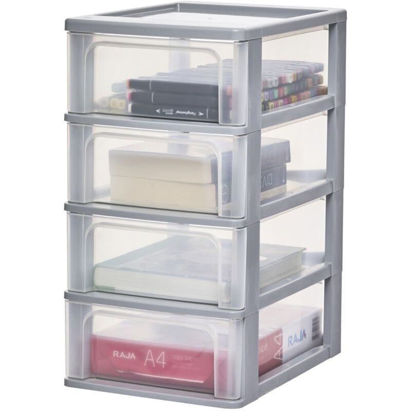 Iris Ohyama, Caisson de rangement plastique A4, 4 Tiroirs Moyens, Gris, OCH-2004