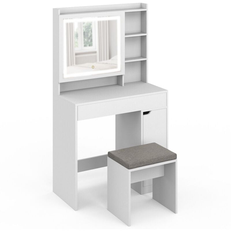 Idmarket - Coiffeuse zelia blanche miroir led avec rangement, 1 tiroir, 1 caisson de rangement et tabouret rembourré