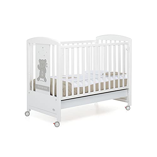 Foppapedretti My Little Love, bois de hêtre, fabriqué en Italie, sommier à lattes de hêtre, grand tiroir, réglable à double hauteur, 4 roues, 131 x 73 x 108 cm, blanc