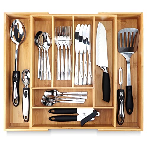 Pristine Bamboo Plateau d'argenterie pour organisateur de tiroir, organisateur de tiroir de cuisine, organisateur de couverts dans tiroir, support de couverts, séparateurs en bois extensibles et