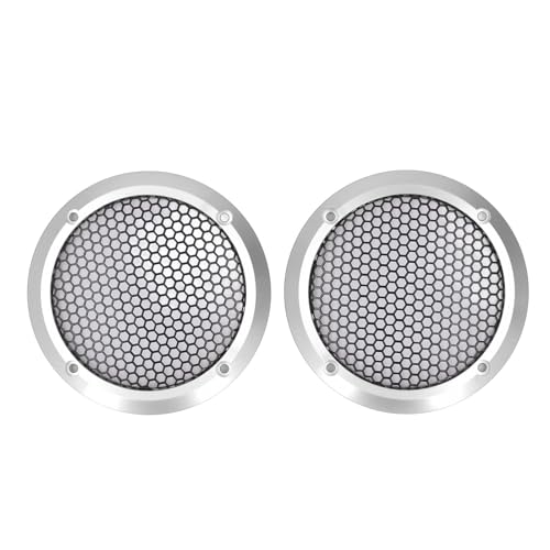 MAGICLULU Grille de Protection pour Haut-parleur 4 Pouces en Maille Métallique Blanche Anneau Décoratif Argenté, Lot de 2 Pièces, Compatible Caisson de Basses Voiture et Maison, Accessoire