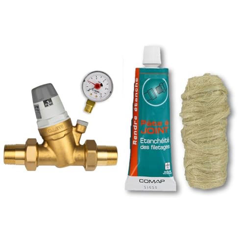 Caleffi Réducteur de pression d'eau 3/4" DN20 pour eau avec cartouche remplaçable et manomètre & Comap S102104 Kit de Etanchéité pâte à joint 50 ml avec bobine de filasse 40 g, Vert
