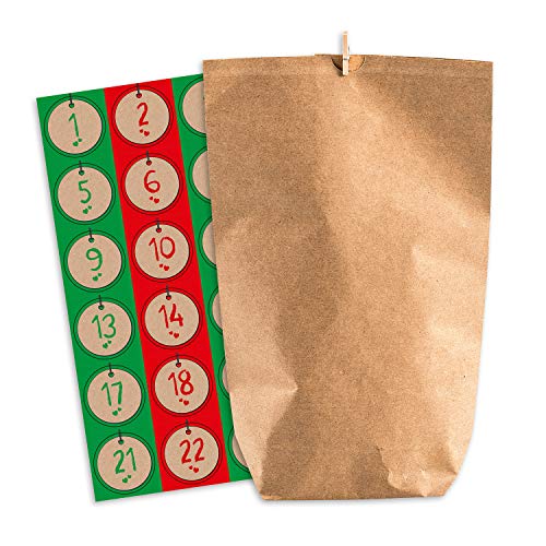 Pajoma Calendrier de l'Avent Moderne avec 1 x 24 sachets en Papier Kraft (Blanc/Marron) à remplir avec Autocollants et Pinces de Noël