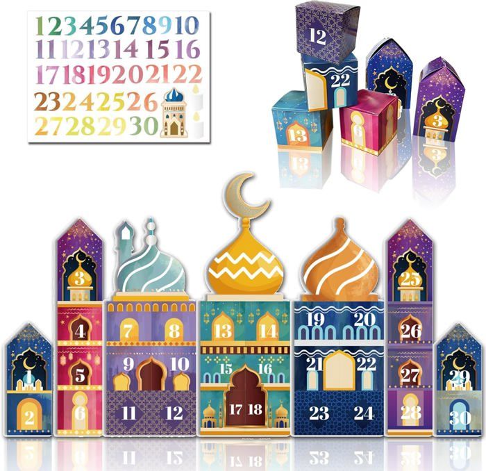 Calendrier du Ramadan à RemplirDIY Decoration Ramadan avec 30 Boîtes Décoratives Mubarak et AutocollantsCalendrier de lAvent à