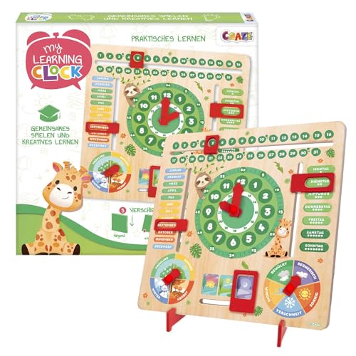 Craze My Learning Clock Animals - Horloge d'apprentissage pour Enfants en Bois - Calendrier d'apprentissage pour Enfants - Tableau éducatif - Horloge Murale - Vert