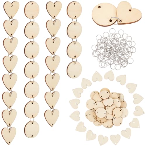 SOFPLATE 100 plaque D'Anniversaire Familiale Étiquettes en Bois en Forme de Cœur avec Trous Cercles en Bois et 100 anneaux de Jonction en Bois Brut pour Bricolage Panneau Familial Calendrier D'Anniver