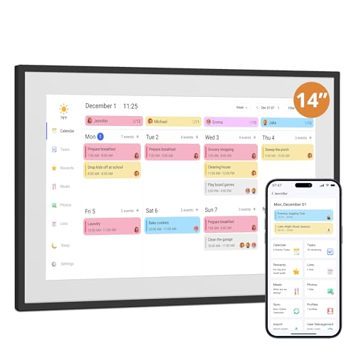Dragon Touch Calendrier mural numérique 14 pouces - 1920 x 1080 FHD - Calendrier mural électronique - Planificateur familial avec mémoire de 32 Go et support mural - Écran tactile - Calendrier de