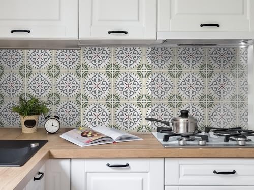 CAMELEO Crédence cuisine adhésive vinyle, effet carreaux de ciment Carthage vert sablé, 200 x 40 cm - Convient aussi comme adhésif décoratif pour meuble - résistant et imperméable