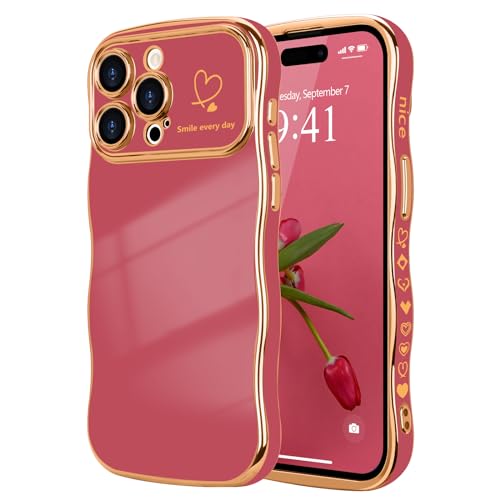 LCHULLE Coque Compatible avec iPhone 16 Pro Max Coeur Housse Forme Ondulée Bouclée avec Protection de Caméra Galvanisé Coque pour iPhone 16 Pro Max Rouge camélia