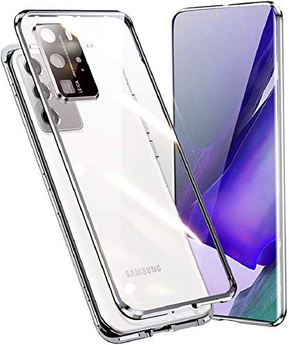 Coque pour Samsung Galaxy Note 20 Ultra 5G Cover 360 Degrés Protection Étui Magnétique Adsorption Intégré Caméra Vitre Protecteur Flip Case Métal Bumper Frame Transparent Verre Trempé Housse,Argent