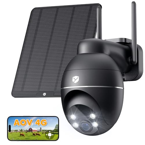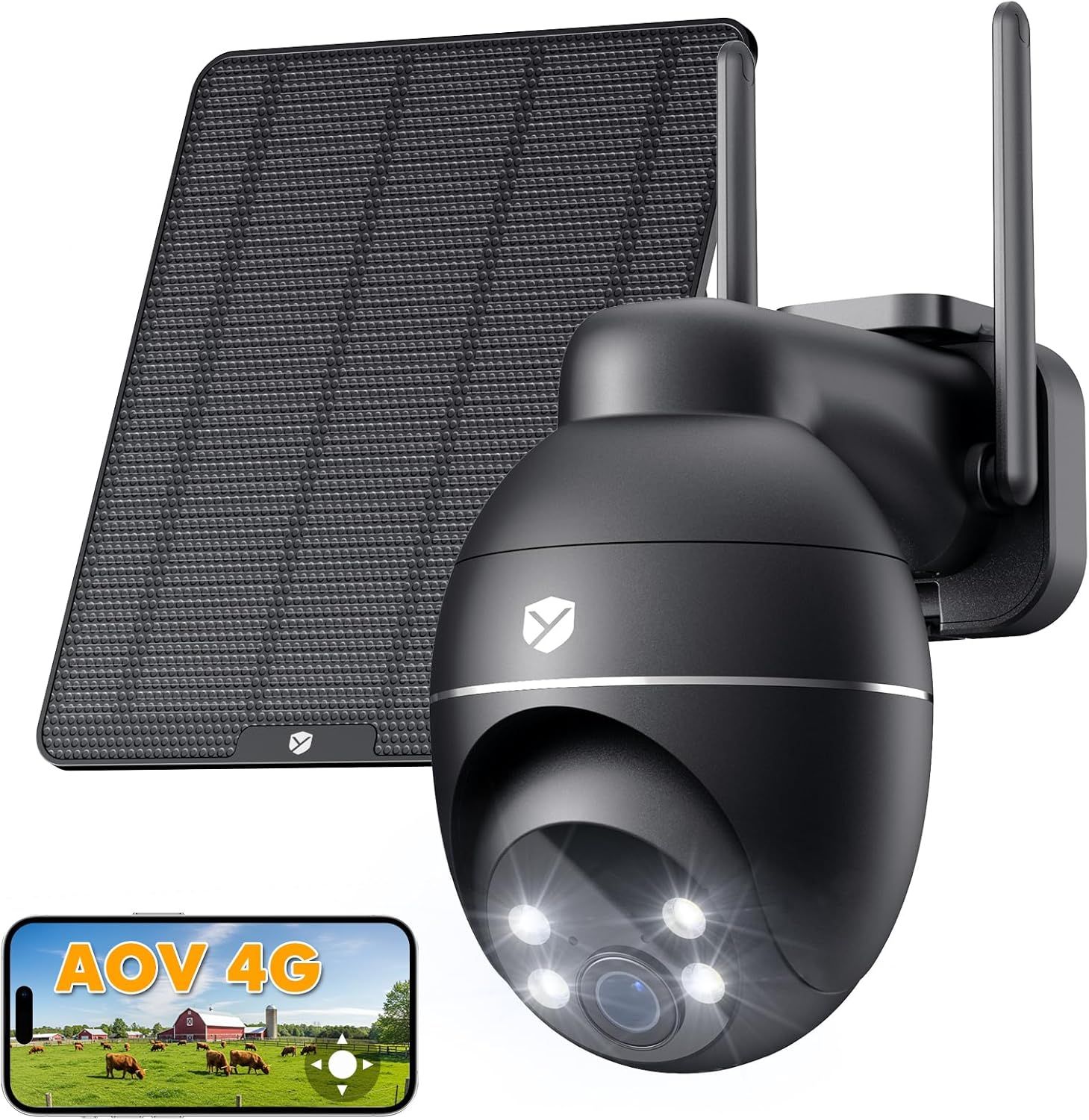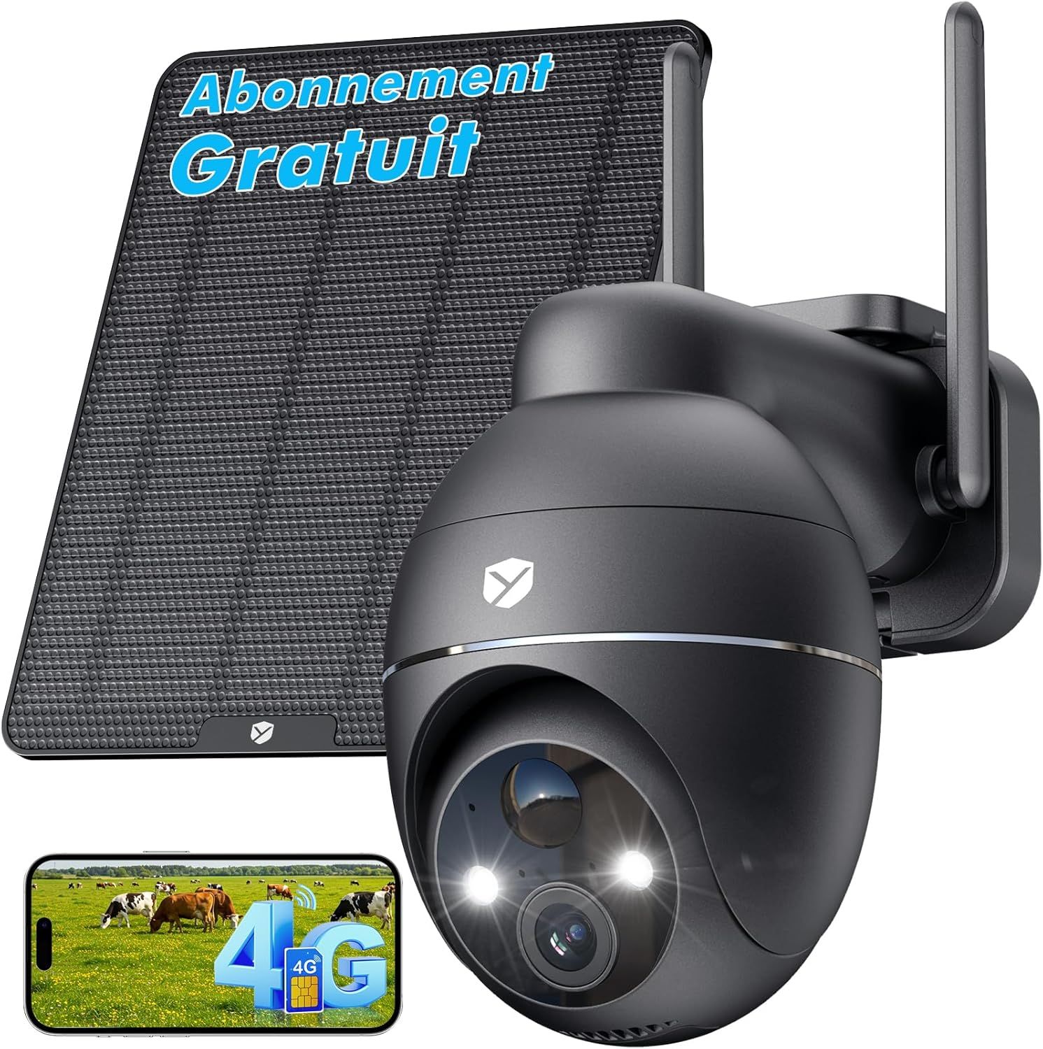 YESKANO 24/7 Enregistrement AOV 4G Camera Surveillance Exterieur sans Fil, 2K 3MP Carte eSIM Virtuelle & 5W Panneau Solaire 360°PTZ Caméra 4G, Détection PIR, 20M Vision Nocturne, Audio Bidirectionnel