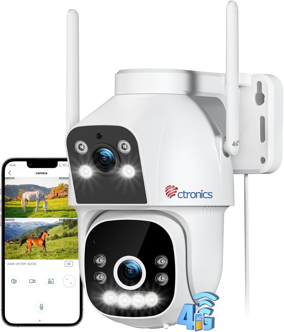 Ctronics 4G LTE Caméra de Surveillance Exterieur【Lien à Double Objectif】 IP Camera Carte Sim avec Détection Humain, Vision Nocturne Couleur, Audio Bidirectionnel, PTZ/Alarm/PC/24 * 7/IP66