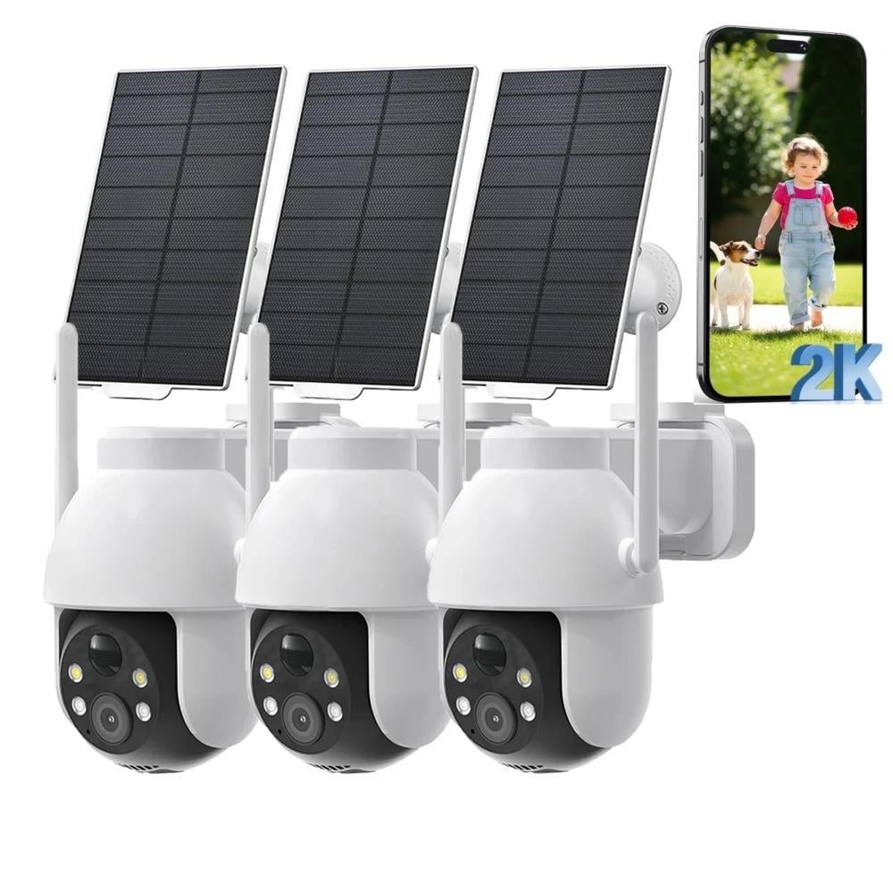Caméra de surveillance solaire 2K d'extérieur à batterie, avec surveillance à 360°, suivi automatique des personnes, vision couleur de nuit, éclairage et alarme sonore, lot de 3