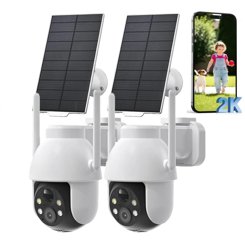 Caméra de surveillance solaire 2K d'extérieur, caméra sans fil d'extérieur avec surveillance à 360°, suivi automatique des personnes, vision couleur de nuit, éclairage et alarme sonore, lot de 2