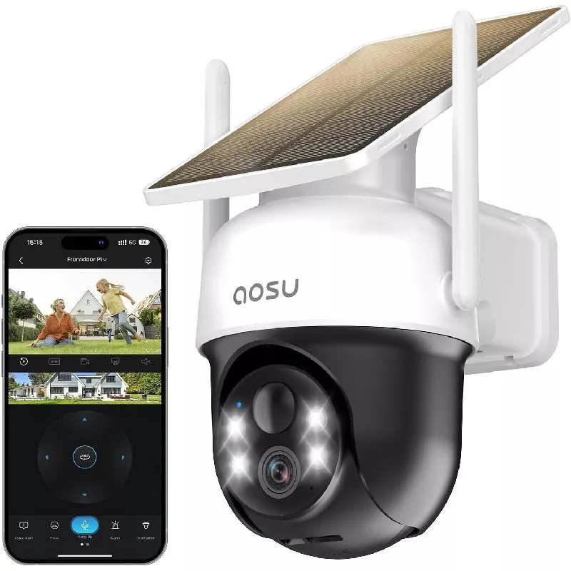 AOSU Caméra solaire 2K pour l'extérieur sans fil 360° vue panoramique Caméra de sécurité extérieure à haute efficacité énergétique avec alarme de projecteur, détection de mouvement