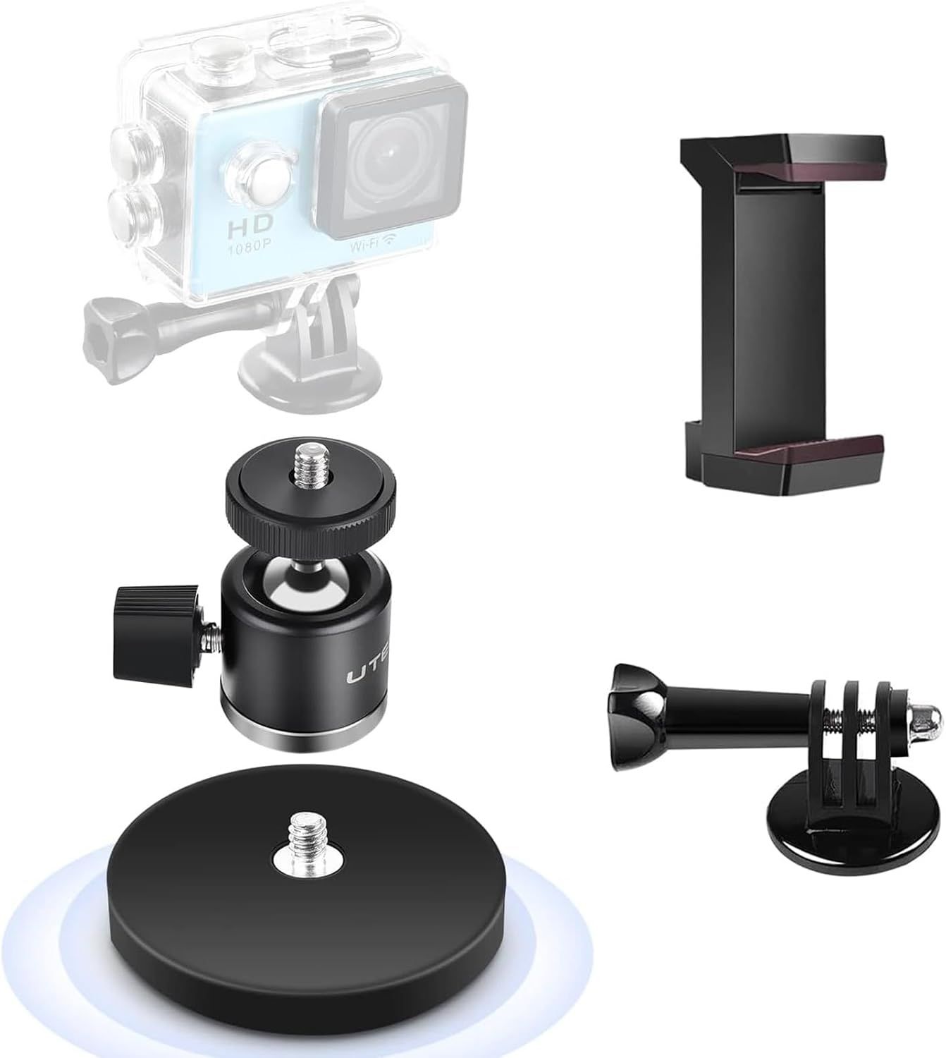 88mm Magnetic Camera Mount, Mini Ball Head Tripod Heads 360° Swivel with Action Camera Mount and Phone Holder, Compatible with GoPro Webcam LED Light