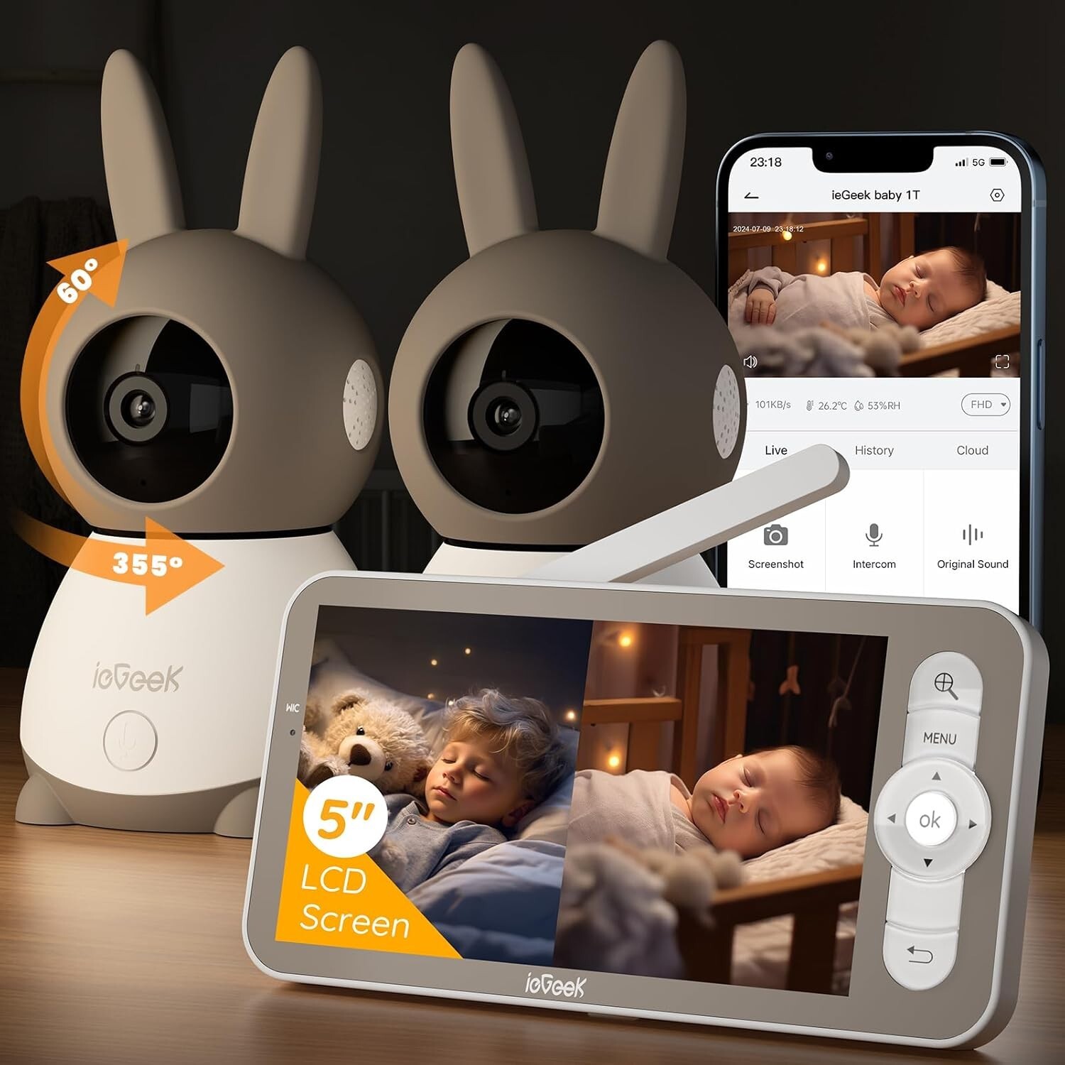 ieGeek 2K/3MP 5" Babyphone 2 Caméra Bebe,PTZ 360° Baby Phone Vidéo connecté