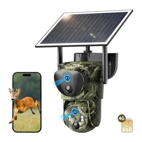 SEHMUA 4G LTE Caméra de Chasse avec SIM à Double Objectif, Caméra Surveillance Solaire Extérieure sans Fil, 360° PTZ Vidéo en Direct, Audio Bidirectionnel, PIR Détection, Vision Nocturne Couleur,IP66