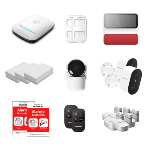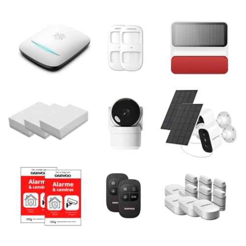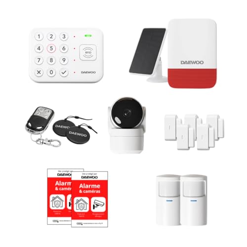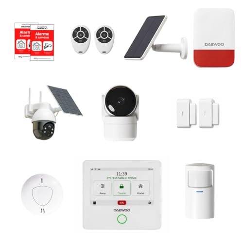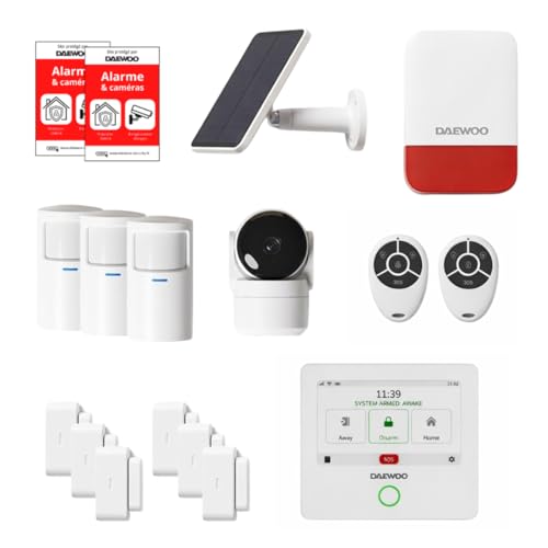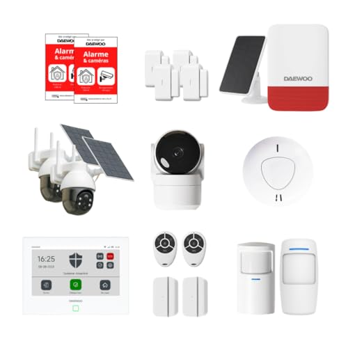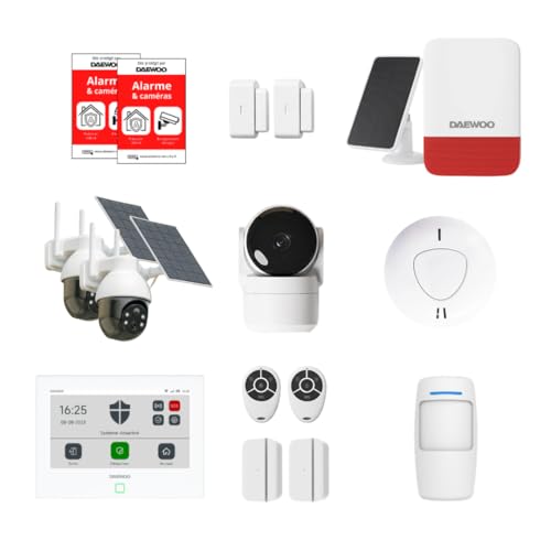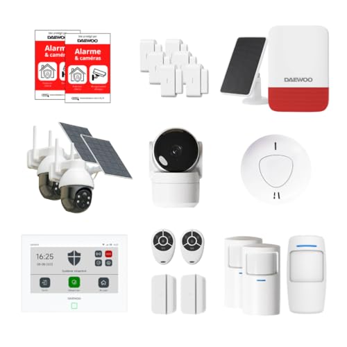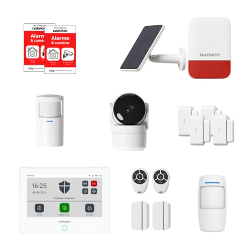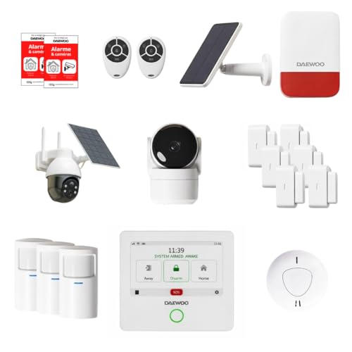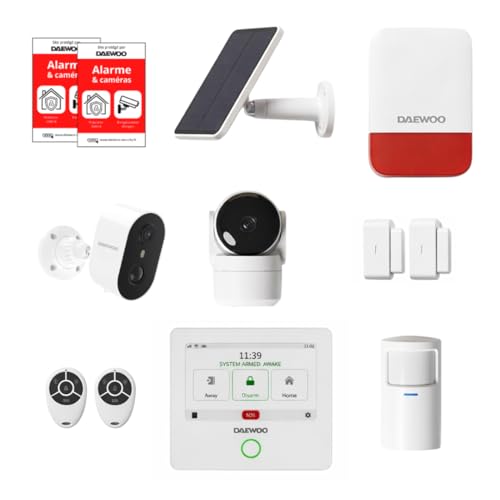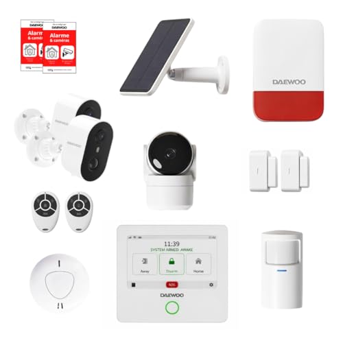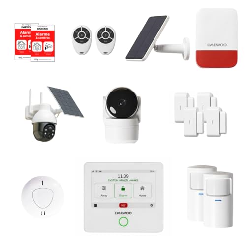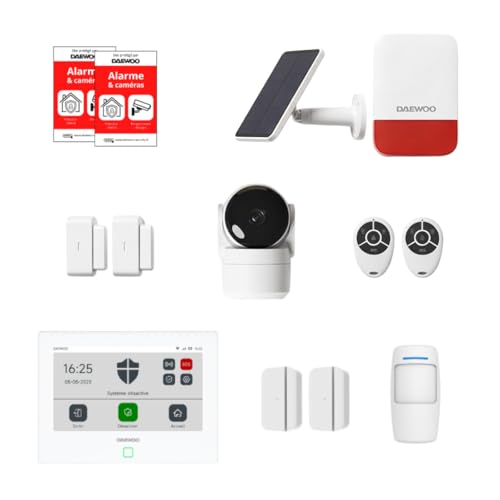 Daewoo Pack Alarme AM373, WiFi/GSM, Centrale à écran Tactile 7'', 20 Accessoires, Sirène Solaire, Livrée avec 2 Caméras Full HD Dont 1 Caméra Solaire