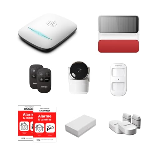 Daewoo Pack Alarme AM311, Centrale à écran Tactile, détecteur de Mouvement adapté aux Animaux, contacteurs de Porte, Vibration, sirène, caméra intérieure et extérieure rotative, contrôle à Distance