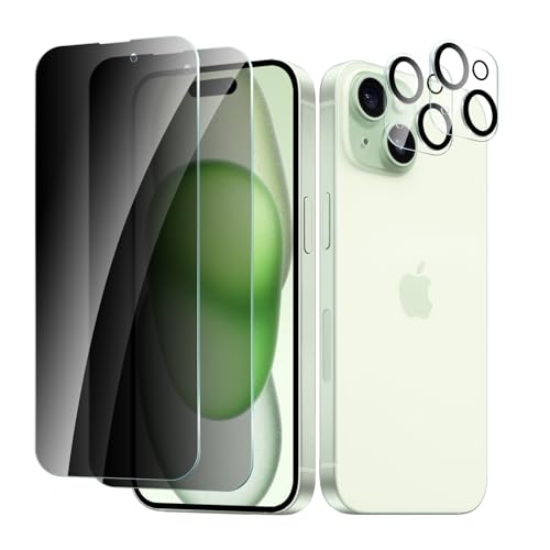 Fylnatc 3×Anti-Espion Verre Trempé pour iPhone 15 + 3×Protection Camera Objectif Arriere appareil Photo avec Outil d'Installation Facile, Privacy Film de Protection écran Anti-Spy, Dureté 9H Glas