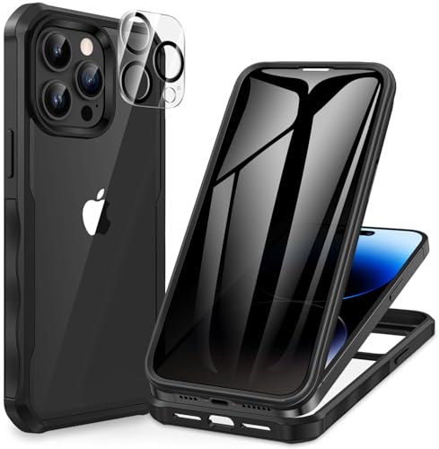 CENHUFO Anti Espion Coque iPhone 14 Pro, avec Protection écran Verre Trempé Anti Espion et Protecteur Caméra[9H HD] 360° Antichoc Téléphone Housse Double Face Case Intégrale Etui Transparente-Noir