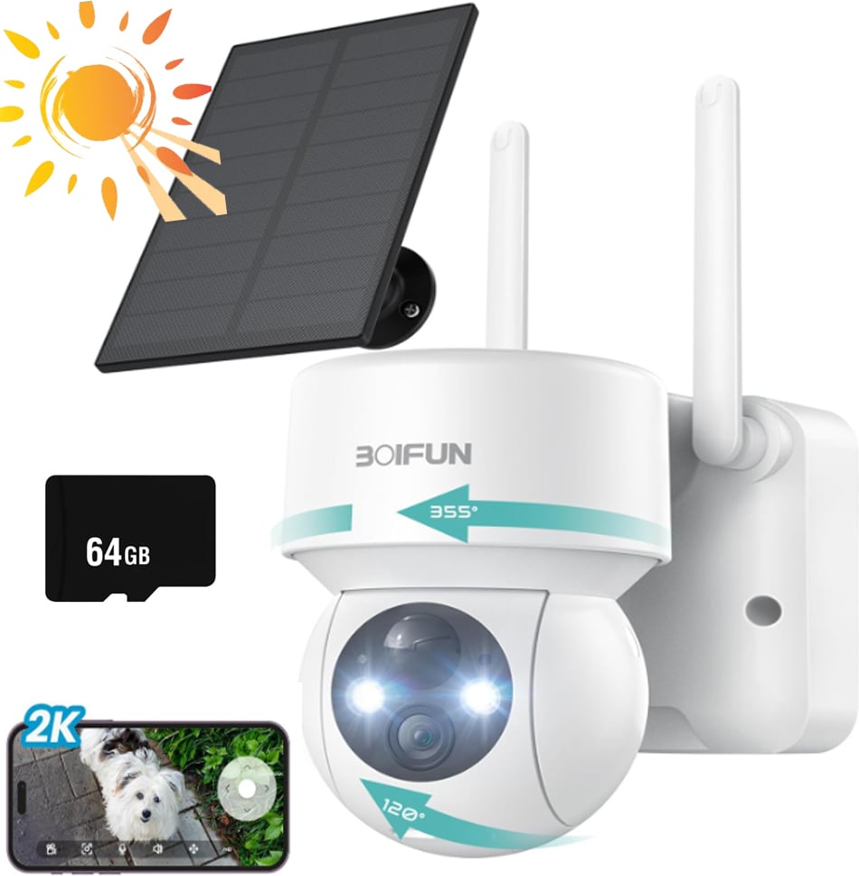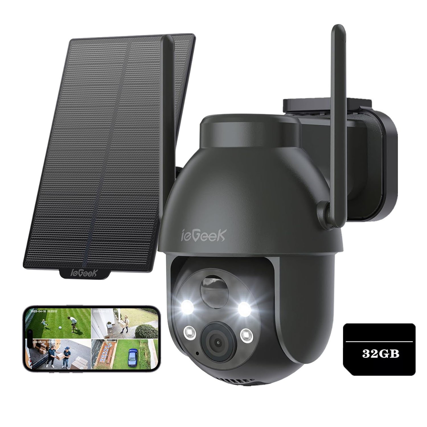 ieGeek 2K caméra de surveillance sans fil extérieur solaire 360 ° PTZ batterie IP caméra, détecteur de mouvement PIR, vision nocturne couleur, audio 2 voies, avec carte de 32 Go