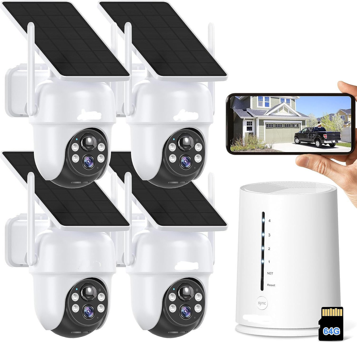 ieGeek 4MP FHD Set caméra de surveillance extérieur Batterie avec panneau solaire, station de base 4CH avec 4X caméras dôme sans fil, 360° pivotant, vision nocturne, + 64GB