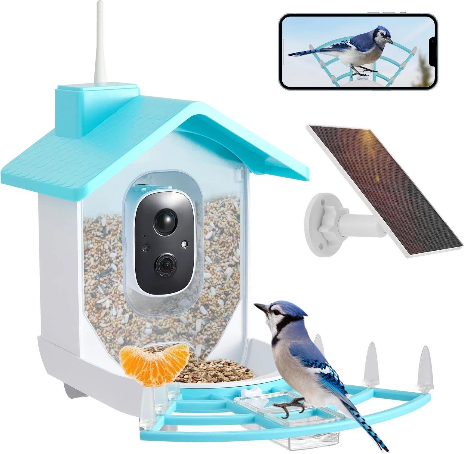 Mangeoire intelligente pour oiseaux - Avec caméra - Alimentation solaire - Wi-Fi sans fil - 4 MP HD - Enregistrement vidéo automatique - Visionnage en direct et en temps réel - Pour l'extérieur - Bleu