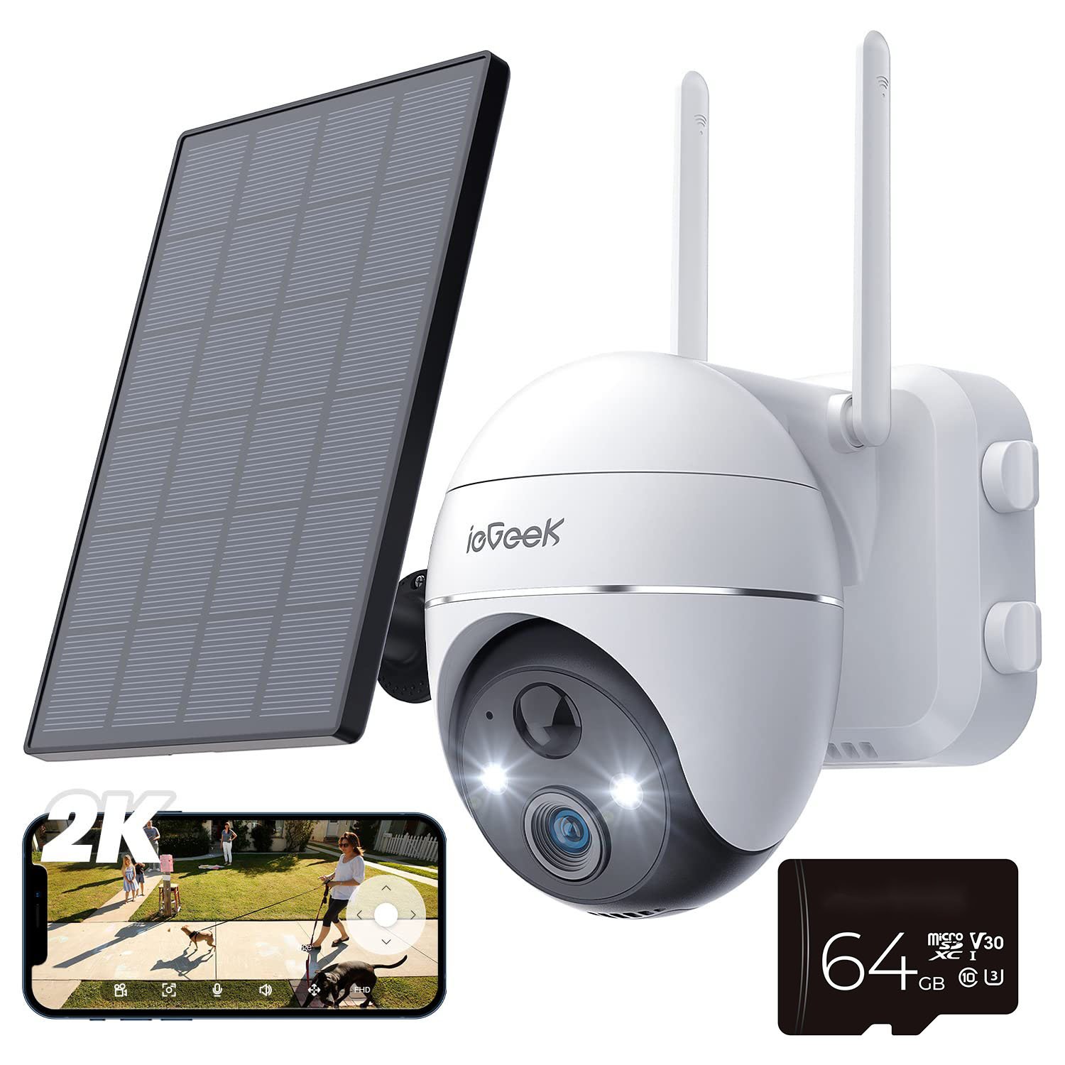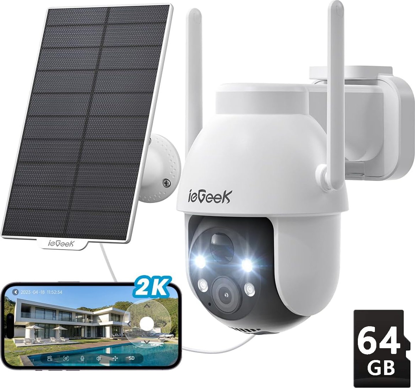 ieGeek caméra de surveillance extérieure batterie solaire, caméra de surveillance extérieure avec vision nocturne couleur, détection de personne PIR, audio 2 voies,3MP, 64GB