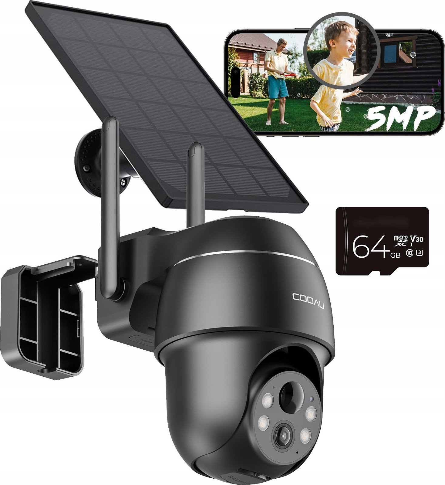 COOAU 5MP solaire caméra de surveillance extérieure batterie avec PTZ, WLAN IP caméra extérieure sans fil avec capteur PIR, vision nocturne couleur, Alexa, audio 2 voies, 64 SD