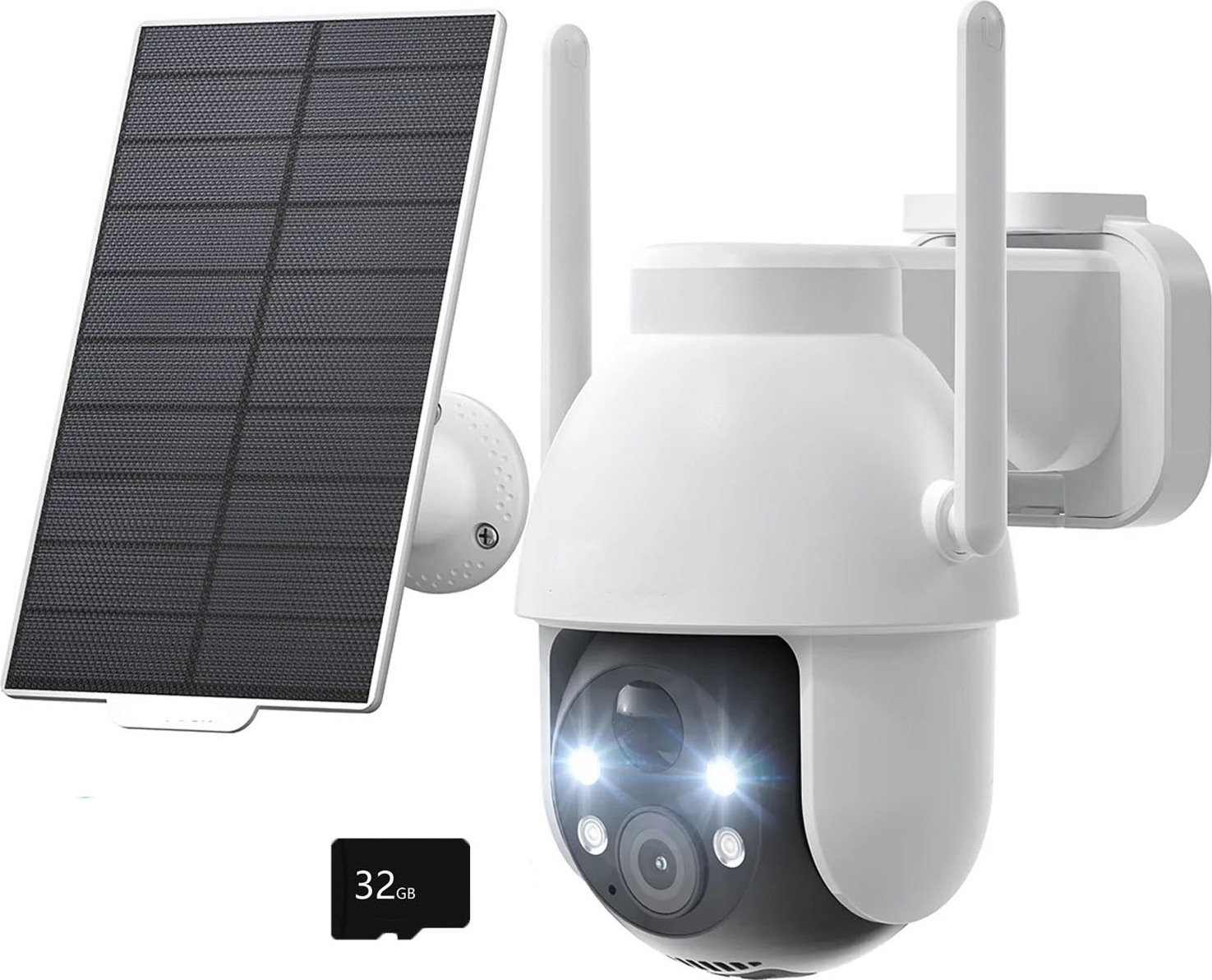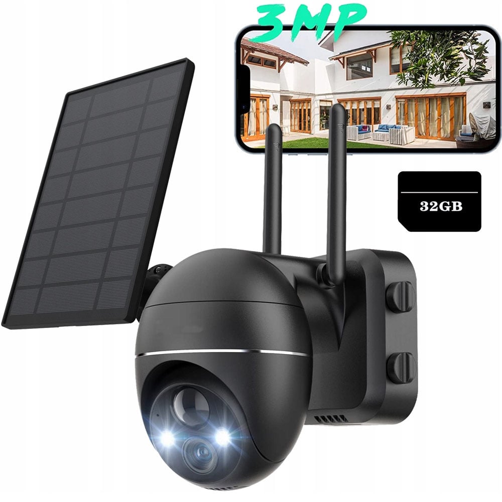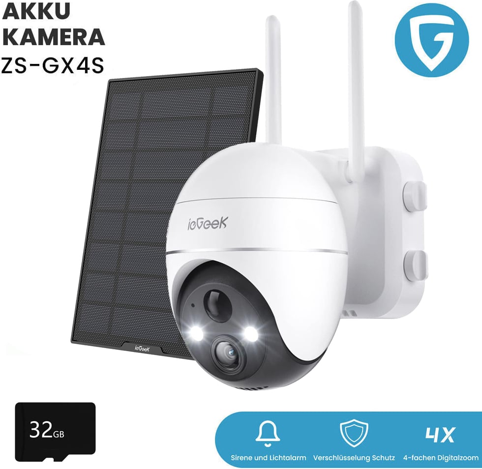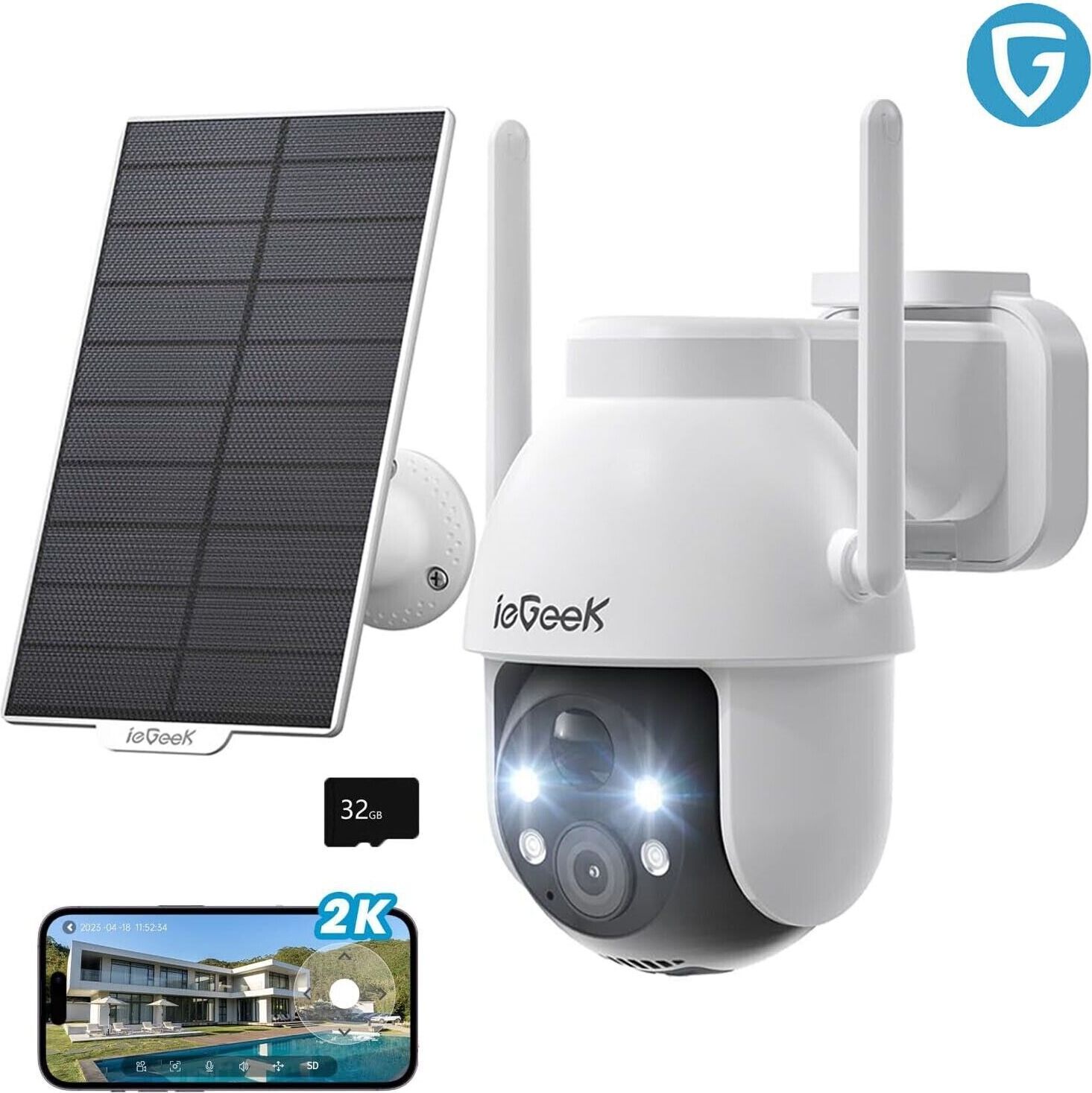 ieGeek 2K HD caméra de surveillance extérieure solaire, 360° PTZ caméra de surveillance extérieure batterie, 2.4GHz caméra WLAN avec détecteur de mouvement PIR, avec carte SD 32GB