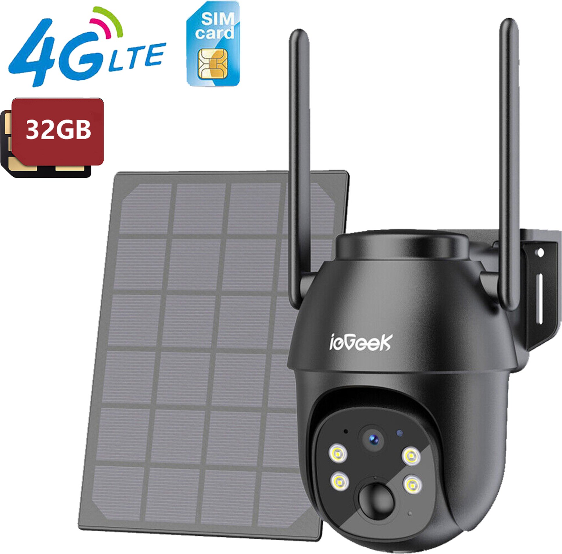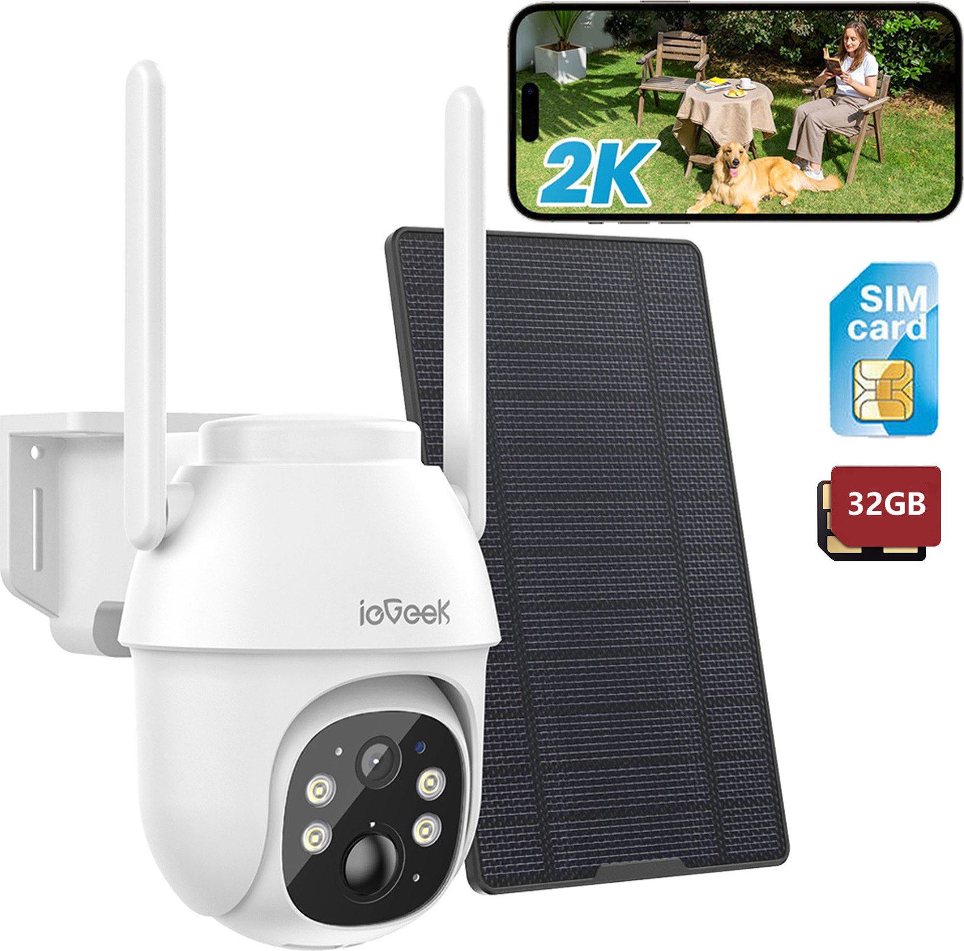 ieGeek 2K 4G LTE caméra de surveillance extérieure batterie avec carte SIM, 360° PTZ caméra solaire sans fil en extérieur sans WLAN, vision nocturne en couleur, avec carte 32GB