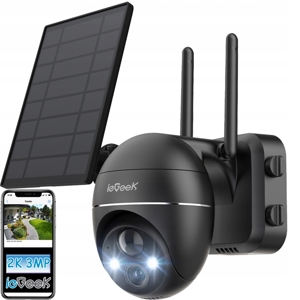 ieGeek 2K 3MP HD caméra de surveillance extérieure solaire, 360° PTZ caméra de surveillance extérieure batterie, 2.4GHz caméra WLAN avec détecteur de mouvement PIR,vision nocturne couleur
