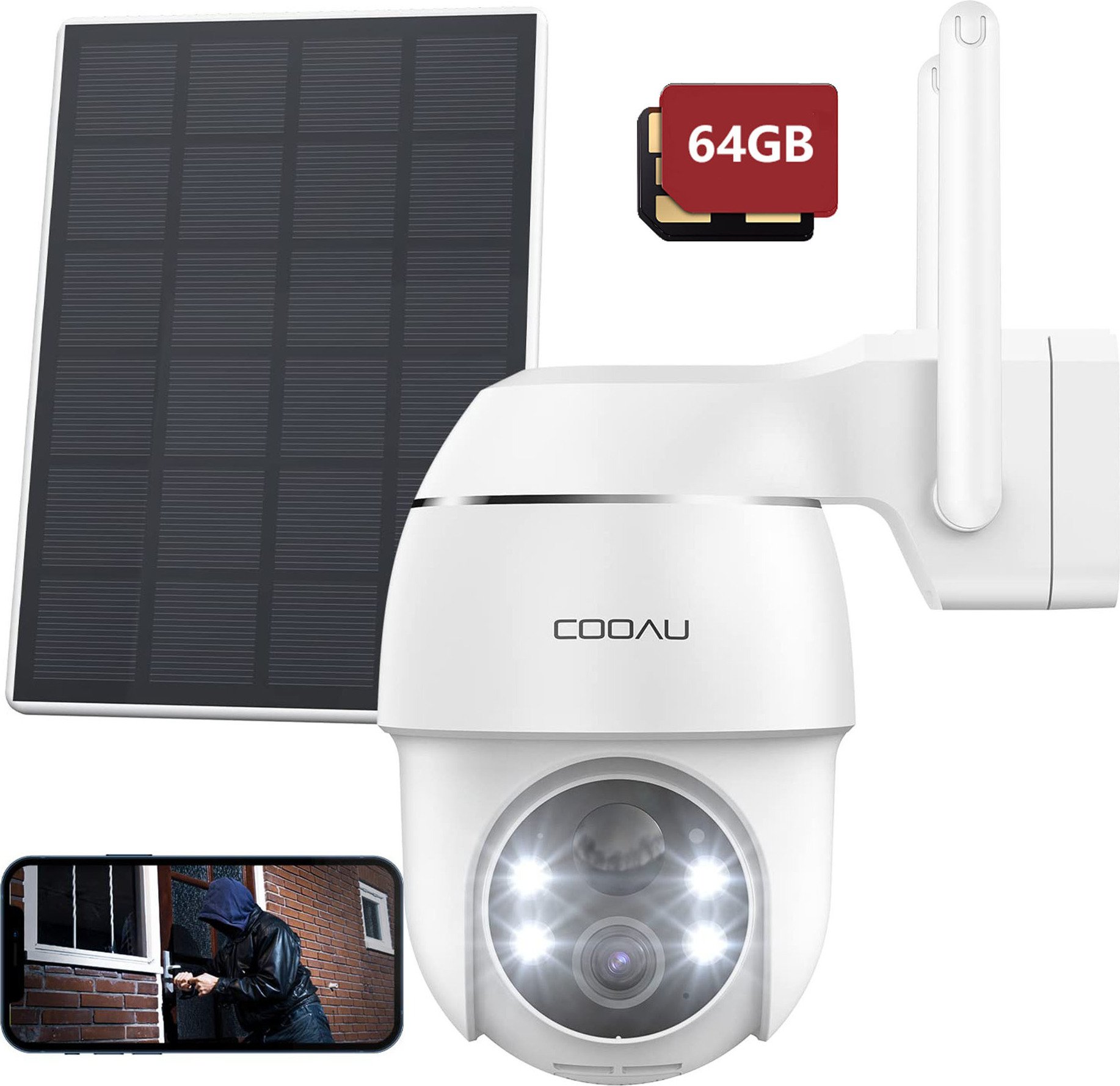 COOAU 2K Solar caméra de surveillance extérieure batterie, PTZ caméra IP WLAN, capteur PIR, 64GB