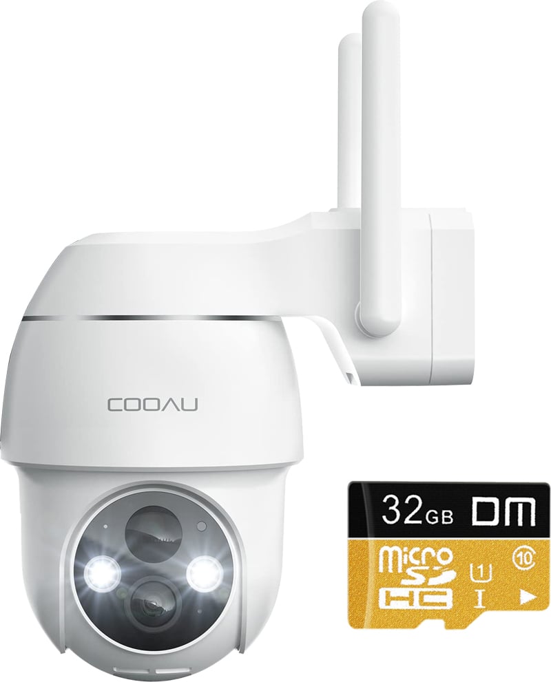COOAU 2K caméra de surveillance extérieure batterie avec carte SD 32G, PTZ 355°|90° caméra sans fil extérieure avec vision nocturne couleur 15m, détecteur de mouvement PIR, détection de personnes/voitures, audio 2 voies, fonctionne avec Alexa, IP66