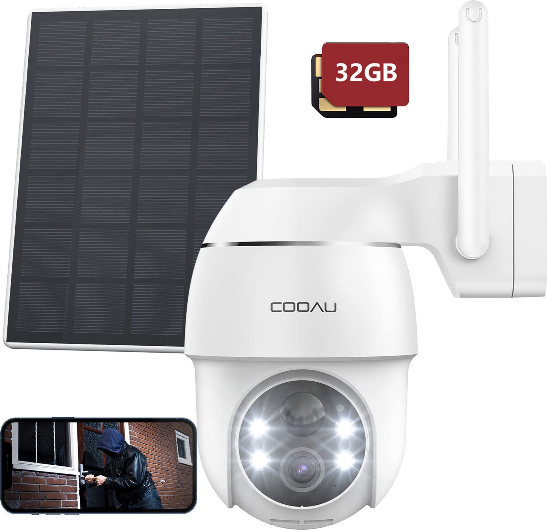COOAU 2K Solar caméra de surveillance extérieure batterie, PTZ caméra IP WLAN, capteur PIR, 32GB