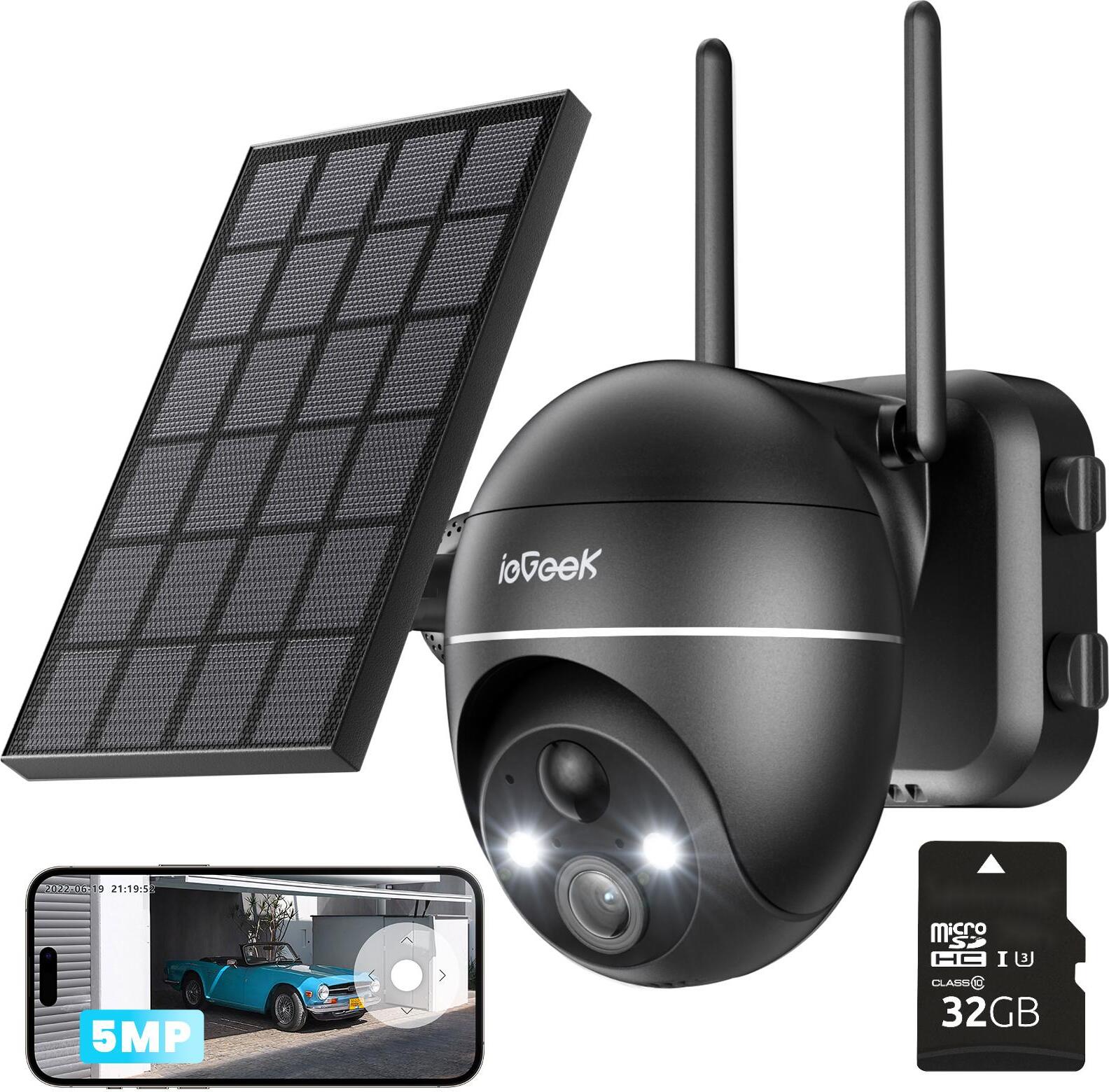 ieGeek 5MP solaire caméra de surveillance extérieure batterie avec carte de 32 Go, 355 |120 ° PTZ caméra sans fil en plein air avec vision nocturne couleur, capteur PIR