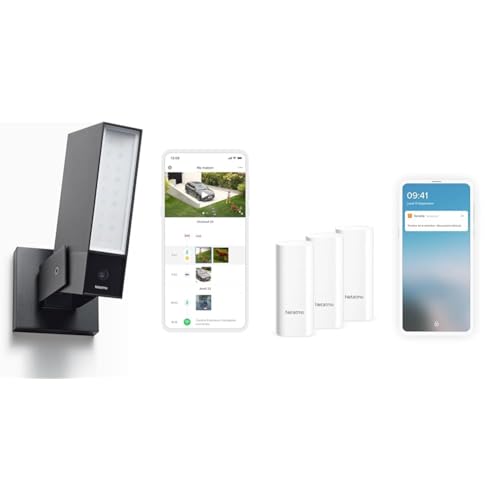 Netatmo Caméra de Surveillance Extérieure Connectée Intelligente avec Éclairage & DTG-FR Détecteurs d’Ouverture Intelligents pour Portes et Fenêtres, sans Fil, monoblocs, Lot de 3, détection