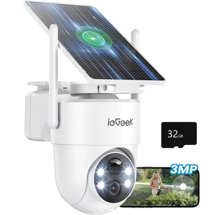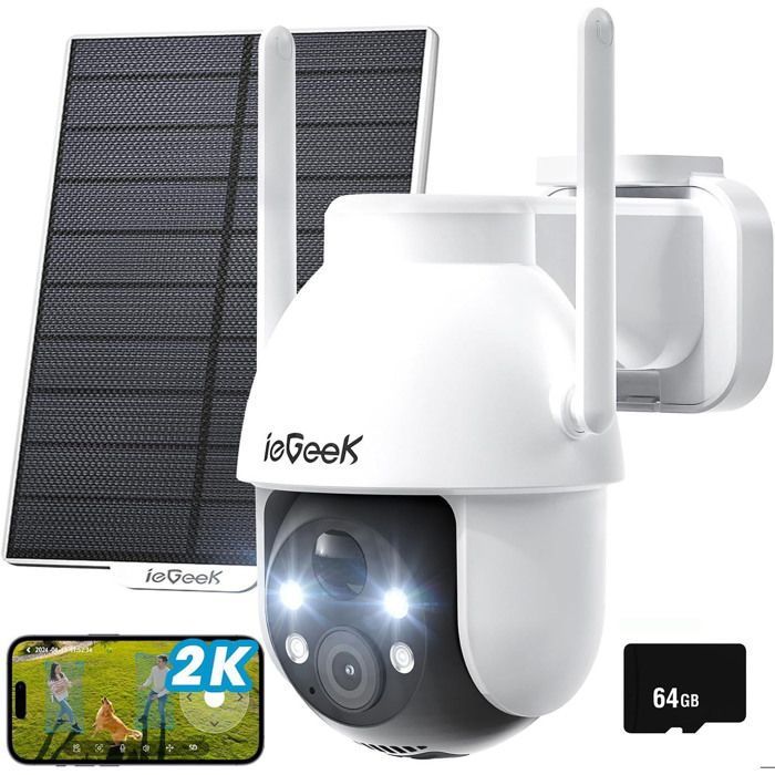 ieGeek 2K Camera Surveillance WiFi Exterieure sans Fil, Camera Solaire avec Batterie, Pan 355°/Tilt 120°, Détection Humaine PIR, Alarme Auditive, Vision Nocturne Couleur, Audio Bidirectionnel