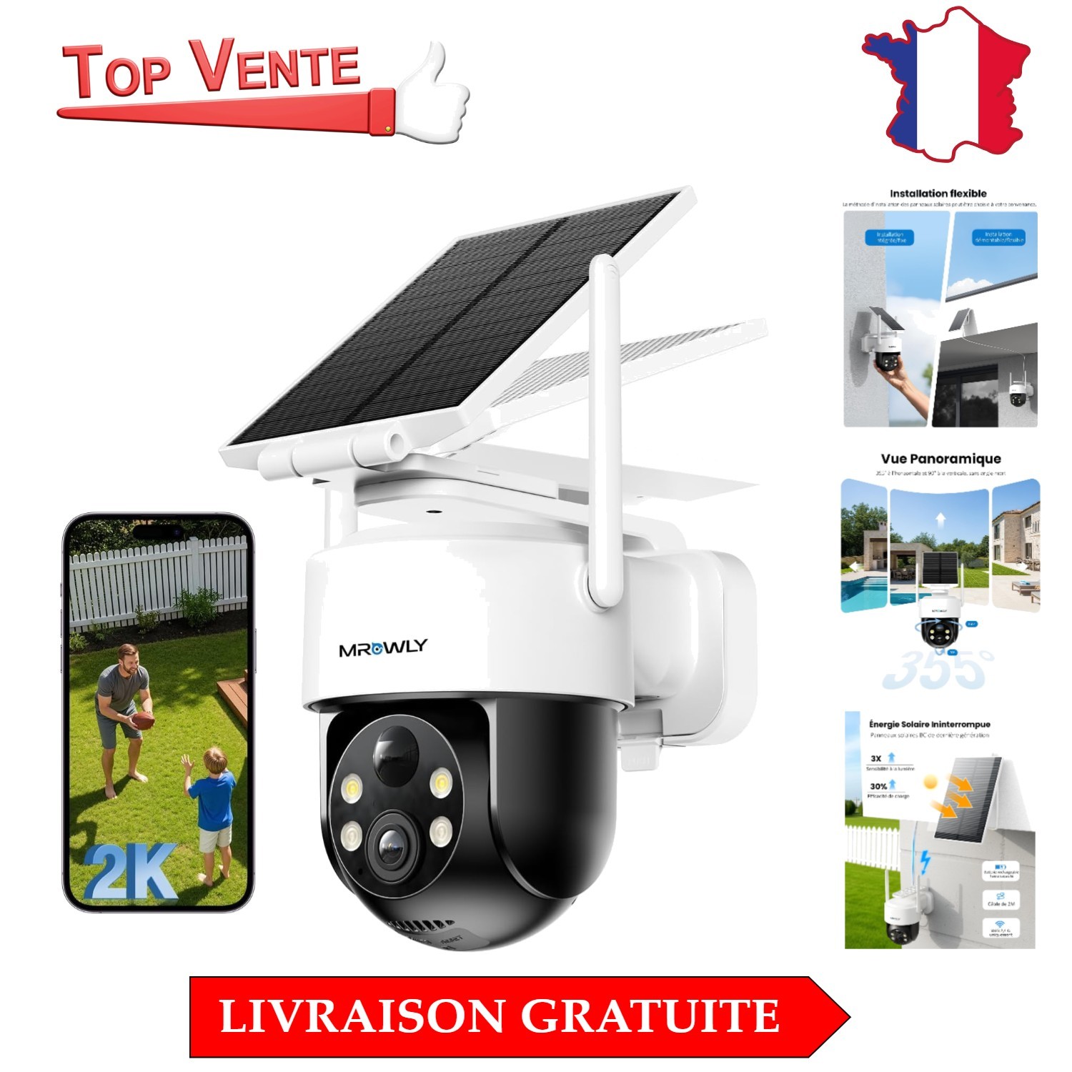 2K Camera Surveillance WiFi Exterieure sans Fil Batterie avec Panneau Intégré...