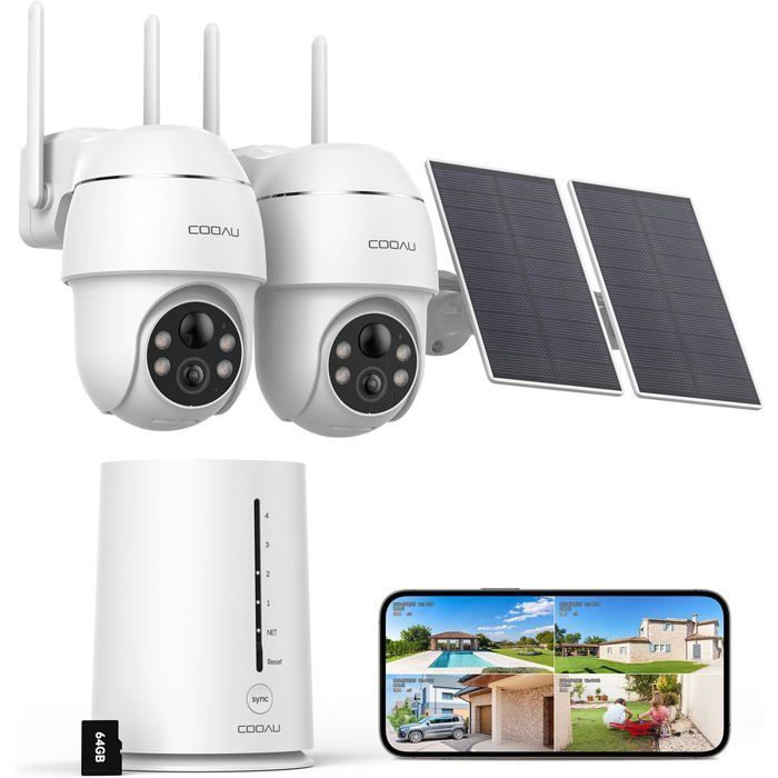 2K Camera Surveillance WiFi Exterieure sans Fil,2 Cam-Kit avec Home Station/Stockage Local 64G/Camera Solaire,360° PTZ Sécurité à Domicile,Vision Vocturne,Alarme,Audio Bidirectionnel,2.4/5G WIFI