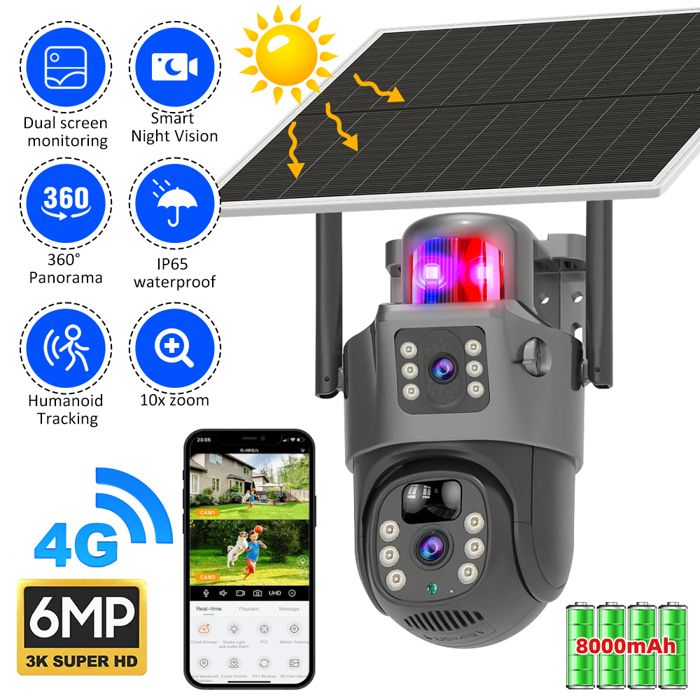 Caméra extérieure à énergie solaire, sécurité sans fil 4G, vidéo HD, double objectif, détection de mouvement, étanchéité IP66, surveillance intelligente