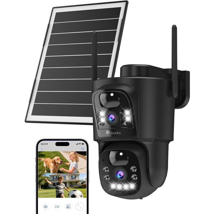 Caméra de Surveillance Extérieure Solaire WiFi Double Objectif PTZ Détection Humaine PIR 8W Panneau Solaire & 10400mAh Batterie