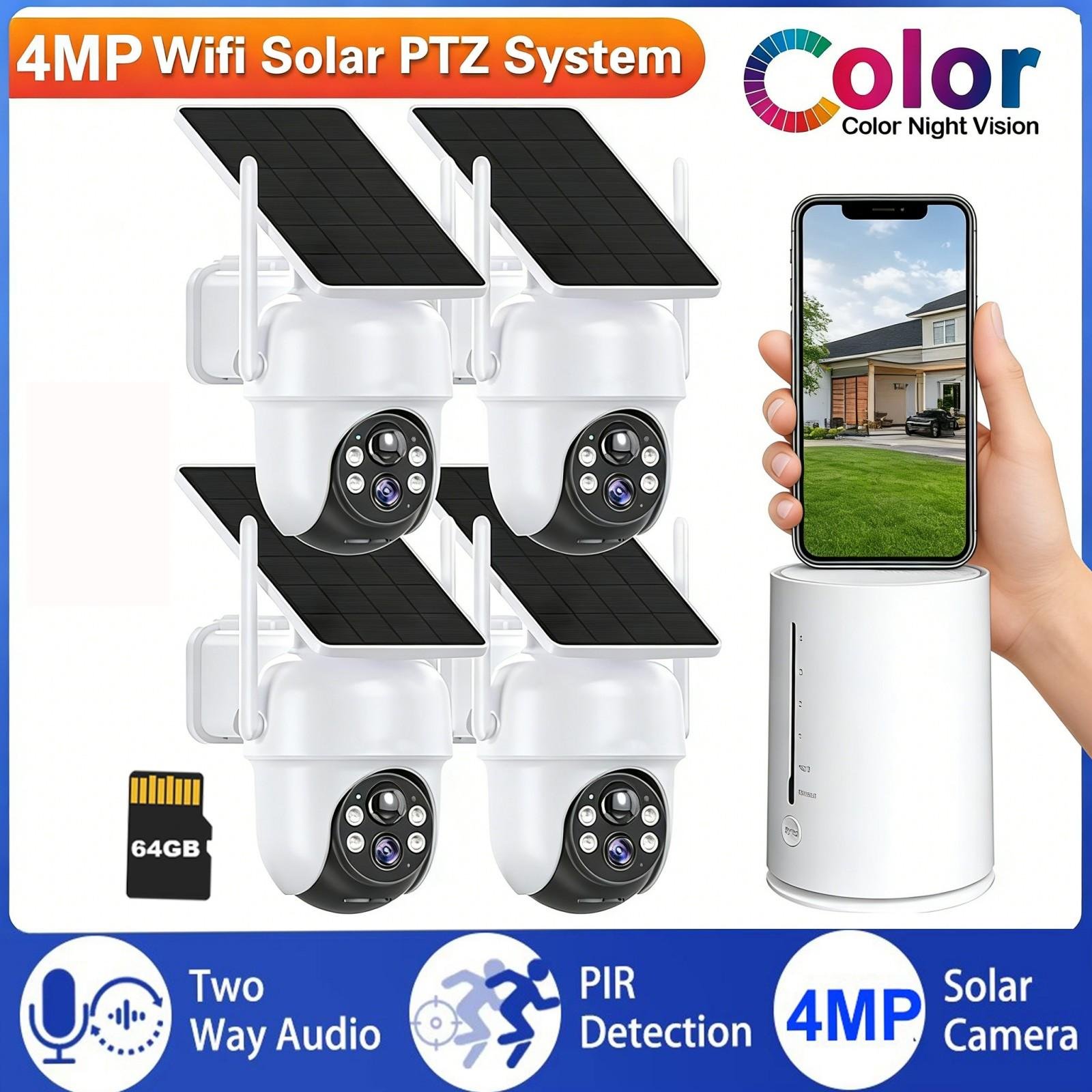 Caméra de surveillance extérieure solaire - 4MP 4PCS Outdoor WLAN Camera Set with 64GB SD Card 2-Way Audio