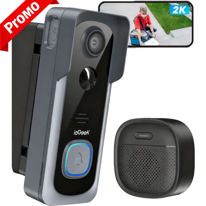 ieGeek Sonnette sans Fil avec Camera 2K Sonnette Exterieur WiFi Sonnette Vidéo avec piles Vision nocturne 15M PIR Etanche IP66