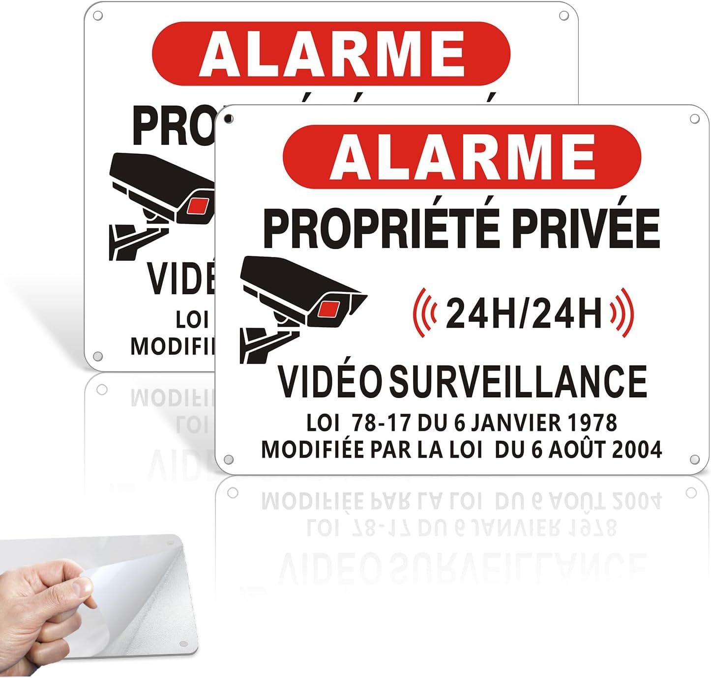 2 pièces Panneau Alarme Aluminium,20 x 15cm pancarte video surveillance avec adhésif autocollant,panneau camera surveillance propriété privée 24H/24H Pour maison, magasin, usage intérieur/extérieur